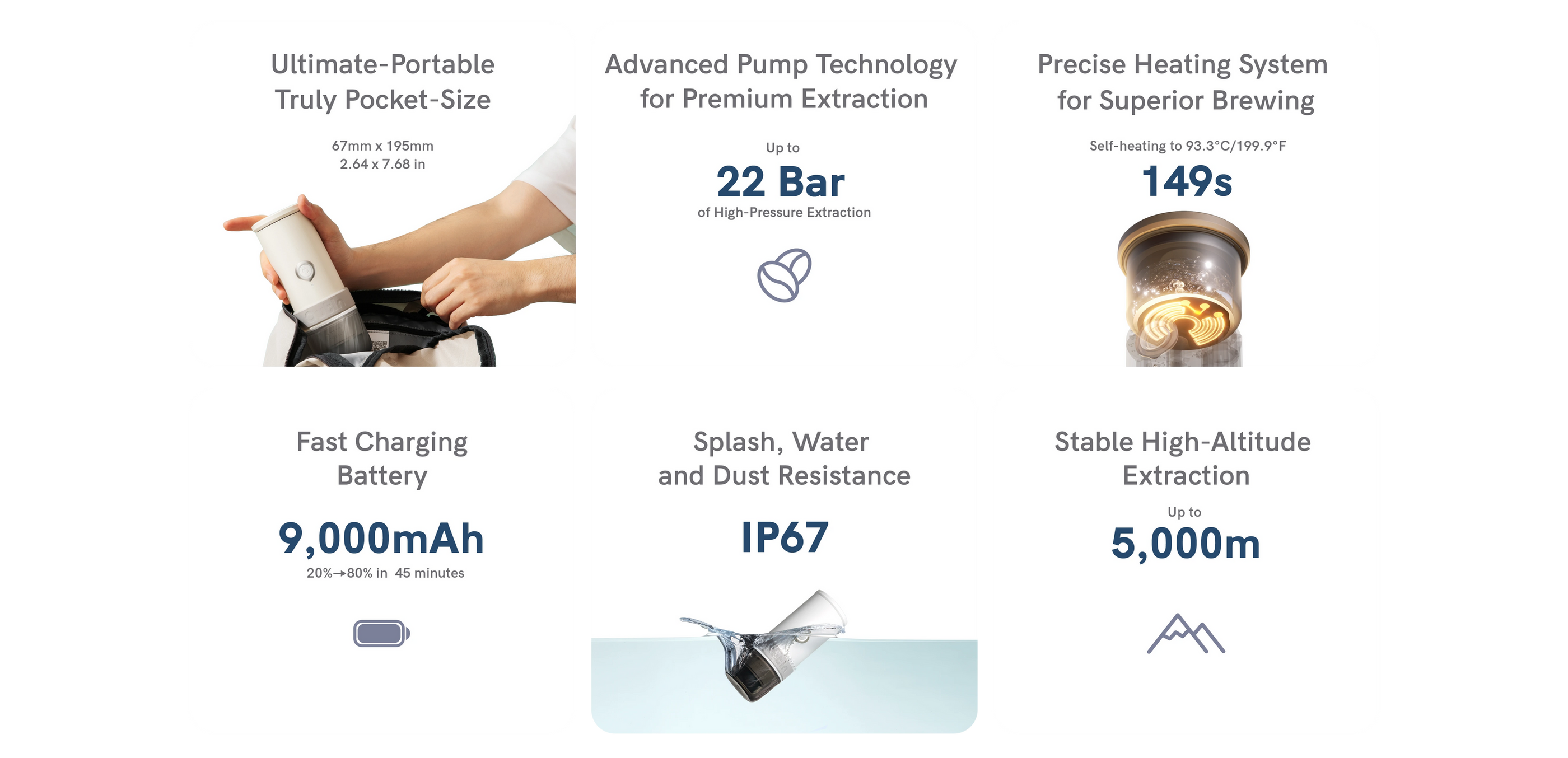 • Bateria i ładowanie: Akumulator 9 000 mAh zapewnia do 6 filiżanek na jedno ładowanie (z zimną wodą) lub ponad 500 filiżanek z gorącą wodą. Szybkie ładowanie: od 20% do 80% w 45 minut, pełne ładowanie w około 90 minut przez USB-C.